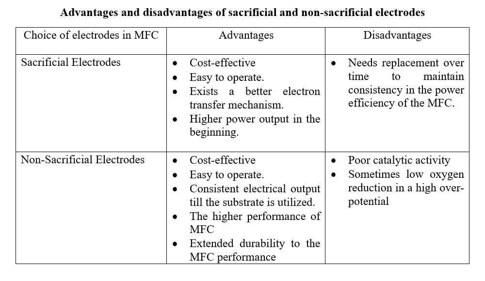 The electrodes that are not intentionally consumed or corroded during operation time are referred to as non-sacrificial electrodes. The non-sacrificial electrodes are selected in electrochemical reactions to ensure structural integrity and functionality over extended periods of usage. In an MFC, the use of non-sacrificial electrodes ensures durability with long-term performance efficiency. Commonly used non-sacrificial electrodes in MFC are graphite or carbon cloth which possess high conductivity, chemical stability, and resistance to corrosive properties leading to long-term operation. Carbon electrodes, such as graphite or carbon cloth, are widely used as non-sacrificial electrodes in many electrochemical systems, including microbial fuel cells (MFCs), electrolysis cells, and electrochemical sensors. Carbon electrodes are chosen for their high conductivity, chemical stability, and resistance to corrosion, making them suitable for long-term operation. Other examples included platinum, gold, titanium, and stainless-steel electrodes. Studies have shown that the packed and brush design of the anodes provides higher power output when compared to planar-type anodes by increasing the anode-specific surface area and consequently the volumetric density of exoelectrogenic bacteria. The brush configuration also has high porosity that helps the microbial load hold onto the anode structure. In an MFC, the non-sacrificial electrodes provide consistent electrical power output over time.